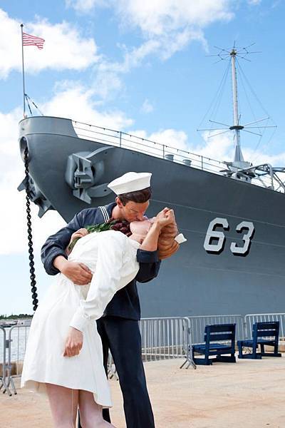 22歲的海軍水手孟杜薩(George Mendonsa)正與當時還是女友的妻子麗塔(Rita Petry)在時代廣場的街上約會,喝了些酒有些微醉的喬治聽到勝利的消息,沉浸在勝利的歡騰之中,只想隨便找一個陌生人親吻,而這位素未謀面的陌生人正是Greta Zimmer,身著護士服的牙科助理。