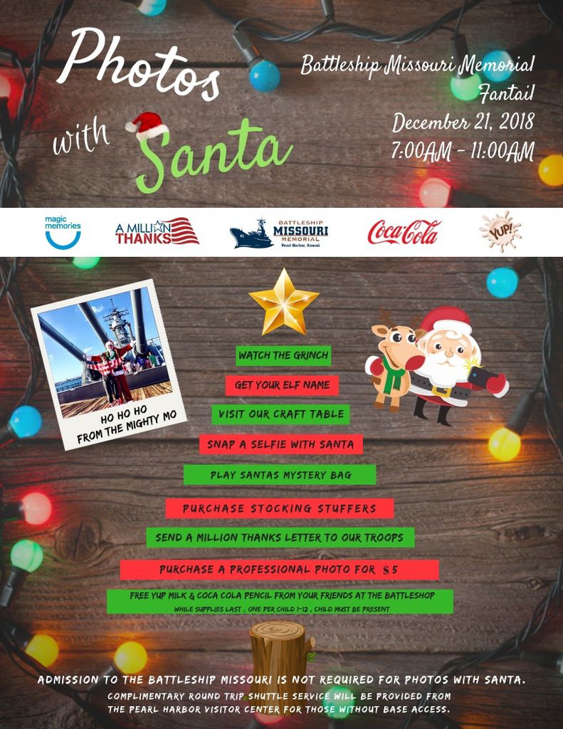 聖誕老人逃離的寒冷的北極來到夏威夷密蘇里號戰艦紀念館和乖小孩們拍照,一起慶祝聖誕節! 2018年12月21日週五,密蘇里號戰艦的全體員工將在碼頭上歡迎駕著雪橇的聖誕老人,歡迎大家一起和聖誕老人拍照! 您可以免費使用個人相機或者手機自己拍照,或者您也可以購買現場專業攝像師為您拍的照片,每張$5美元。紀念館當天提供限量版的密蘇里號Logo咖啡杯還有限量版可客制化的戰艦造型聖誕樹吊飾讓遊客購買。紀念館準備了多樣的活動歡迎大家一起來參與喔!